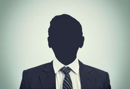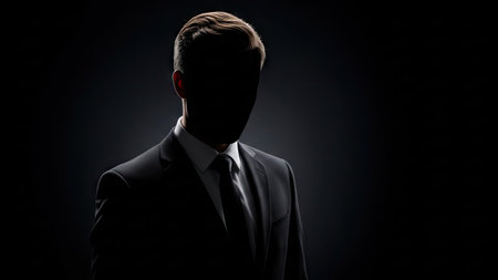 A man in a suit is silhouetted against a dark background. The image features high contrast, focusing on the outline of the figure and formal attire. The lighting suggests a studio setting, suitable for various business or conceptual uses. The composition emphasizes mystery and anonymity.