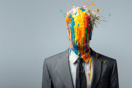 Colorful paint explosion from a suited figure in a minimalist studio setting