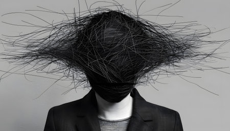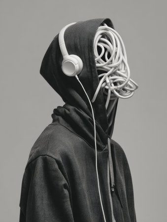 Headphone cord is coiled around the neck of a figure wearing a hoodie, symbolizing a mental trap and illustrating the struggles of modern life.