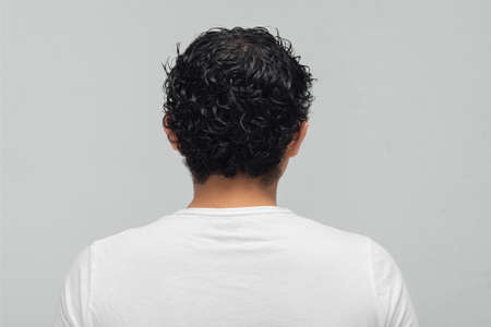 back of the head of a young indian male with copy space for text isolated on grey.
