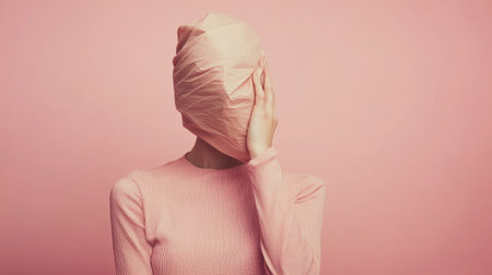 Young woman hiding her face with textile on pink background