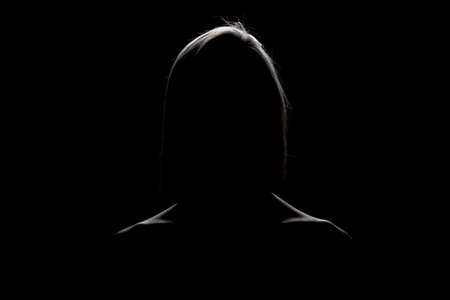 No name, anonymous person hiding face in shadow, human identity. Silhouette portrait of unknown woman standing alone, indoor studio shot, isolated on yellow background