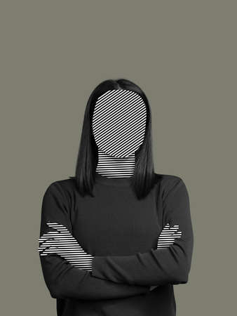 Contemporary art collage of woman with blank face space, faceless isolated over white background