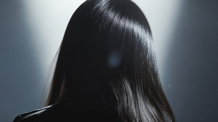 A captivating back view of a person with long dark hair captured in a dramatic spotlight. The image evokes mystery and elegance, highlighting hair texture.