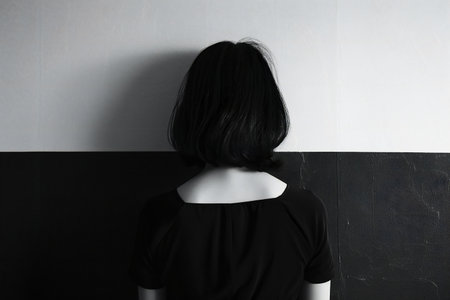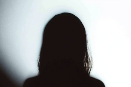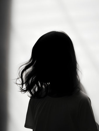 Silhouette of a woman with long hair, conveying mystery and introspection, contrasted against a soft white background, ideal for themes of identity and self reflection