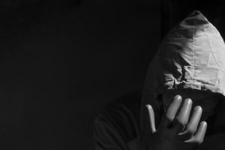 Focus at hand in glove of mysterious man in hoodie with sunlight and shadow in dark background with black and white style, concept for mystery, crime, hacker,danger, thief, internet fraud