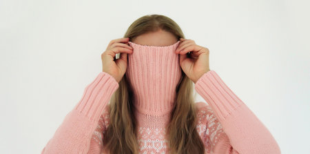 Portrait of funny young woman covering her face with knitted sweater or having fun standing on white background