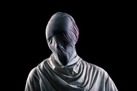 Portrait of woman in white theater mask and hood on black background. Concept of mental disorders, hypocrisy. High quality photo