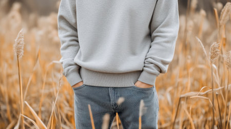 A man standing in a field wearing jeans and sweater, AI