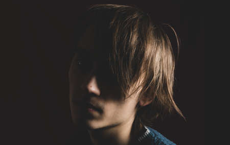 Portrait image of a young guy with long hair on a dark background