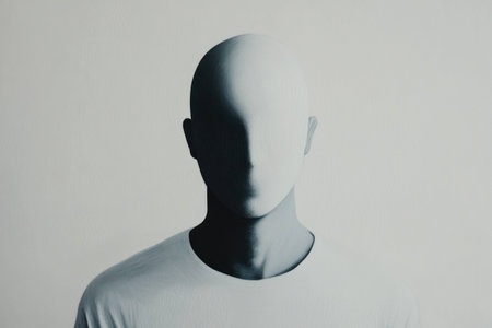 Faceless person wearing a plain white t-shirt, standing against a light blue background, emphasizing anonymity and minimalism in modern art.