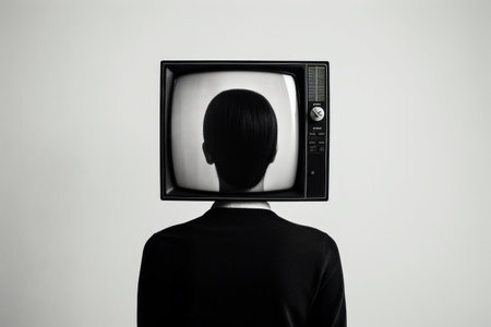 Person with television on their head with black and white image of person's head. Generative AI.
