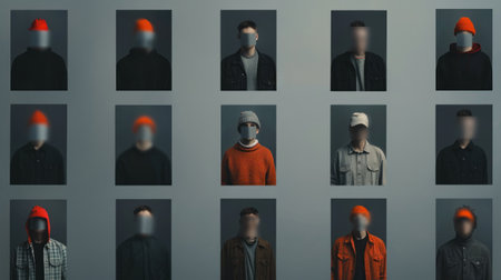 A grid of 15 portraits, each featuring a person with their face blurred. The individuals are dressed in casual attire, creating a sense of anonymity and mystery.