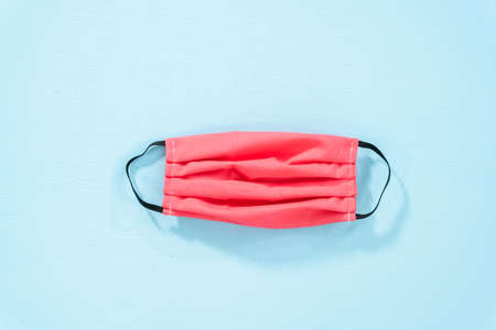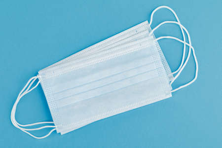 Blue surgical protective mask on a blue background. Coronavirus (COVID-19) hysteria is leading to mass mask shortages in the beginning of 2020.