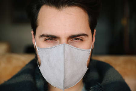 Close up portrait of a white man wearing a face mask and looking worried. Shallow depth of field isolated on black background. High quality photo