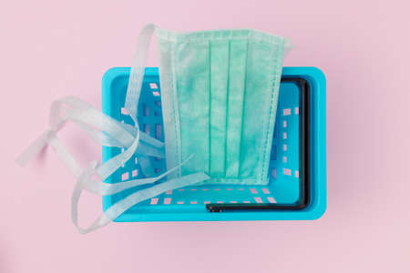 biosafety element white mask accompanied by technological objects on a unicolor background