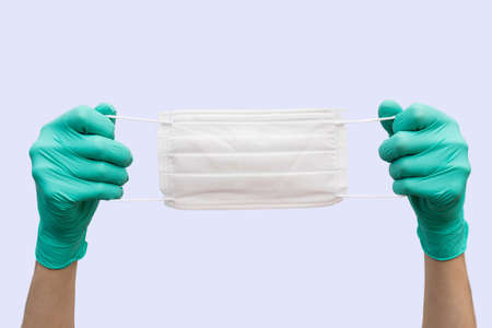Two hands of a Doctor in medical gloves holds medical surgical mask. Ready for covering the mouth and nose. Top view, close up, on blue background