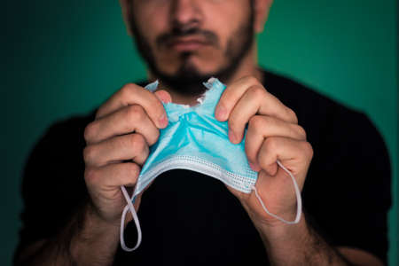 A young adult man in a black T-shirt tearing a light blue disposable mask with white folds and strips on a navy green background alluding to the theme of the COVID-19 pandemic known as coronavirus