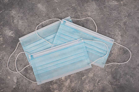 Standard 3-ply face masks as protection during the pandemic on light brown background. Selective focus