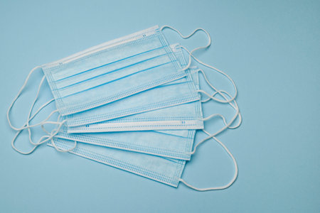 Surgical disposable face masks on blue background with copy space. Top view. Medical blue masks. Medical respiratory bandages as preventive measure against viruses. PPE equipment isolated on blue
