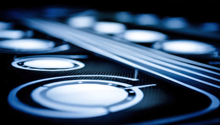 Macro view of blue-lit, futuristic circuit board. Luminous circles & lines create a modern design