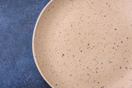 Round empty colored ceramic plate on concrete texture background. Preparing dishes and cutlery for dinner