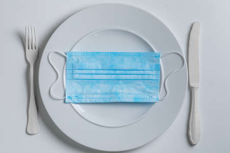 Medical mask on an empty plate with cutlery on white background. Covid-19 concept