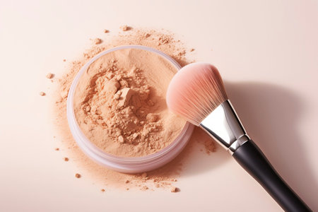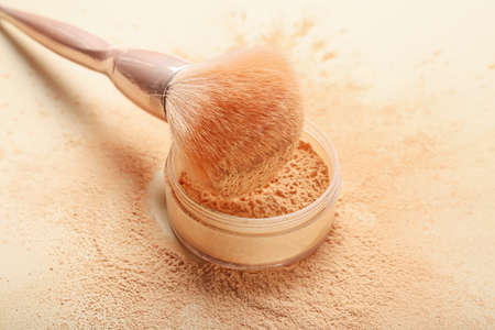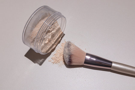 Spilled natural tone powder from a glass cosmetic jar and makeup brush on a beige background. top view. decorative cosmetics