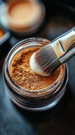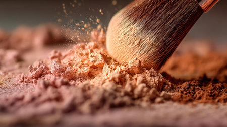 This close-up image captures a makeup brush sweeping through powdery pigments, illustrating the beauty and artistry involved in cosmetic application and glamour.