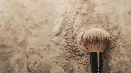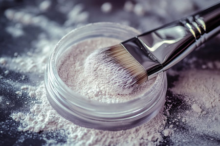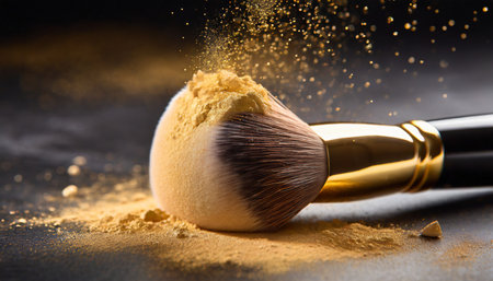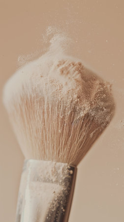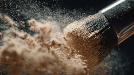 Close up view of makeup brush releasing fine powder, creating dynamic and artistic effect. image captures texture and movement of powder, evoking sense of beauty and elegance
