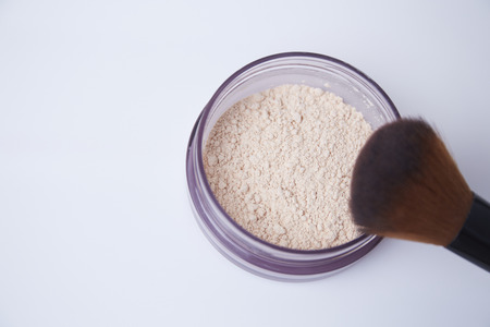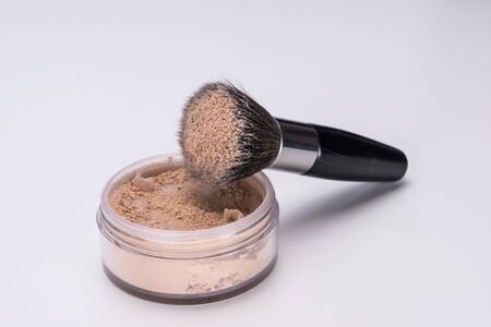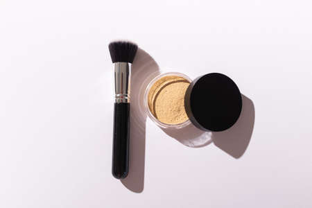 Makeup brushes and powder on a white background. Selective focus.fashion