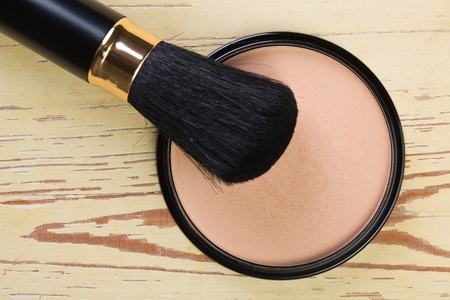 This image showcases an open compact powder with a rich brown shade resting on a rustic wooden surface, accentuating the fine texture and beauty of makeup essentials for every routine.