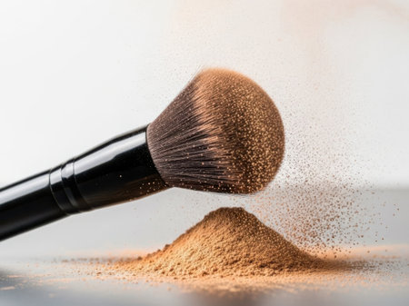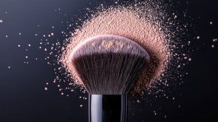 Capturing the dynamic moment of powder dispersing from a beauty brush, this image highlights the elegance and precision of cosmetic application in a visually striking manner.