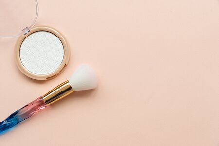 Face powder with brush on pink background. Copy space. Flat lay. Top view. Skin care or morning routine concept
