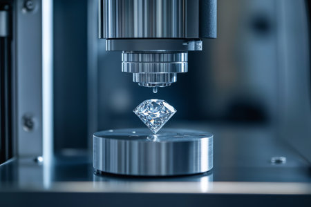 A skilled gemologist closely inspects a brilliant diamond using a microscope, showcasing the intricate details and quality of the gemstone in a professional laboratory setting.