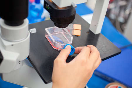 The researcher is using microscope with cells culture on petri dish to do the lab test in the research of drugs or chemicals at the laboratory room.