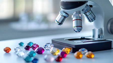 A detailed close-up image showing a microscope alongside a variety of colorful gemstones on a laboratory workbench, illustrating the intersection of science and beauty in gemstone analysis.