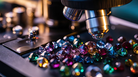 A vibrant display of colorful gemstones is examined under a microscope, showcasing their brilliance and intricate details in a scientific lab.