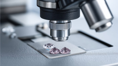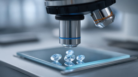 This image features a close-up view of diamonds placed under a microscope lens, showcasing their stunning facets and reflections in a well-lit laboratory environment.