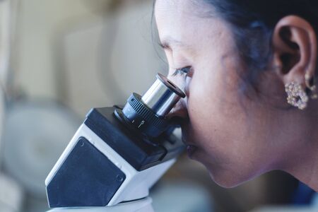 Close up of woman using a microscope in a laboratory - Female scientist busy in looking into microscope.