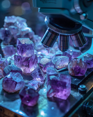 This image features a modern microscope set among sparkling crystals, illuminated by soft bokeh lights, creating an enchanting atmosphere for scientific exploration and study.