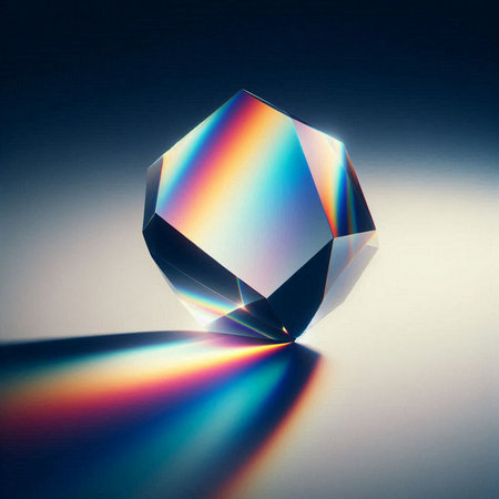 A clear crystal prism sits on a smooth surface, scattering light into a spectrum of colors. The sunlight enhances the vibrant display of reflections around the prism.