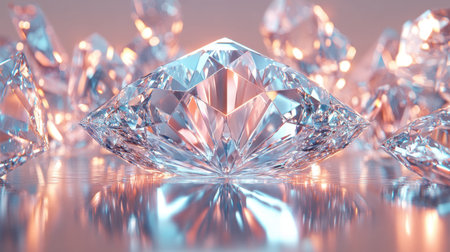 A collection of sparkling diamonds is arranged to showcase their brilliance and clarity, reflecting soft light on a smooth surface, creating an elegant and luxurious atmosphere.