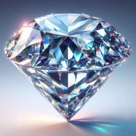 A highly detailed image features a diamond gemstone with intricate facets, illuminated by light and showcased against a dark backdrop, creating captivating reflections and shimmering details.