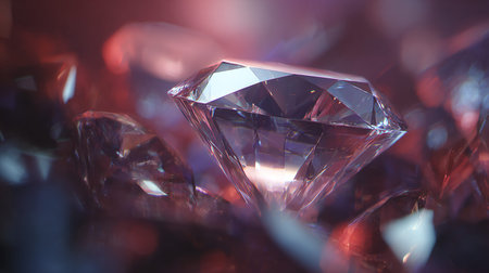 Large, sparkling diamond sits on a glittering purple surface, reflecting light and color in a mesmerizing display of luxury and brilliance, creating a captivating vertical composition