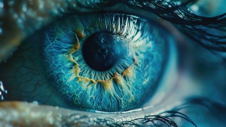 This striking close-up captures the vivid colors and intricate textures of a human eye, highlighting the remarkable details of the iris and pupil.