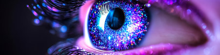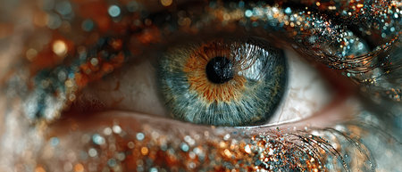 A striking close up of a vibrant eye adorned with colorful glitter and artistic makeup highlighting intricate details and textures.