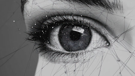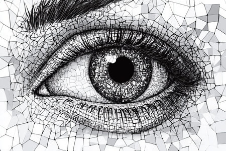 Intricate black and white eye illustration with mosaic texture on a technical background
