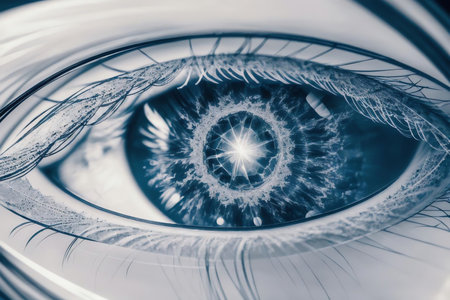 A close-up of a human eye, capturing the intricate details of the iris, pupil, and surrounding blood vessels, with light reflections creating depth and realism.