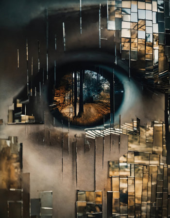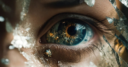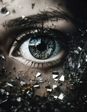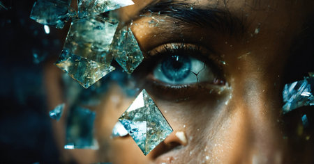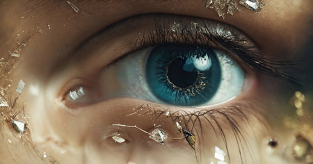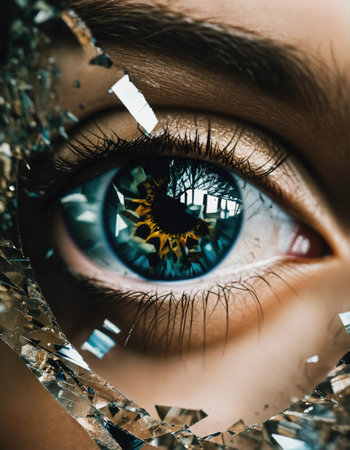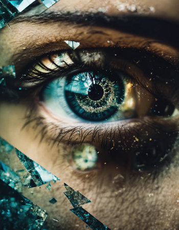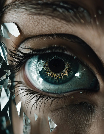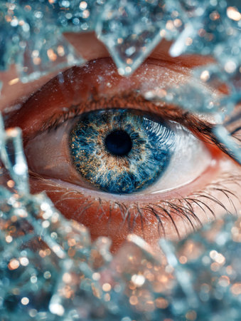 A striking close-up of a vibrant blue eye framed by shattered glass shards, creating a dazzling mosaic of reflections and intricate light patterns.
